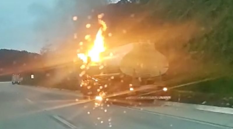 De acordo com o solicitante, um caminhão tanque transportando 20.000L de gasolina apresenta chamas na cabine.