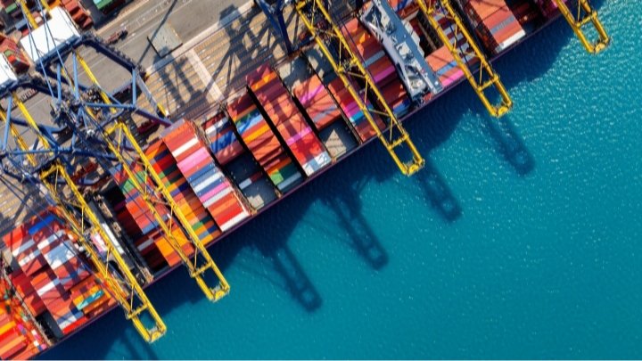 Vista aérea de um terminal portuário com navio porta-contêineres Reprodução/FreePik baixar em alta resolução |