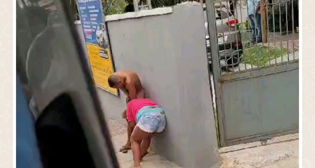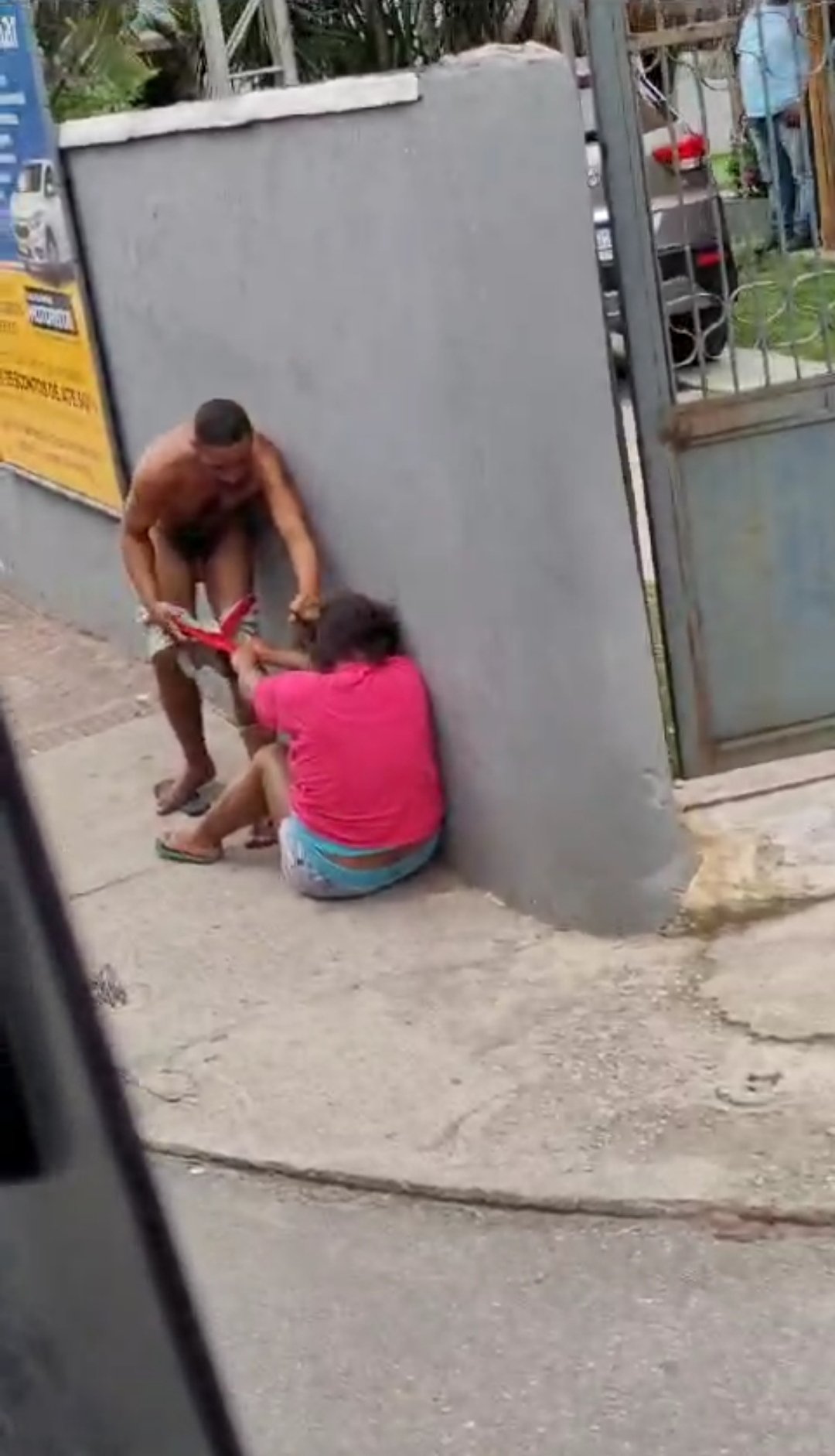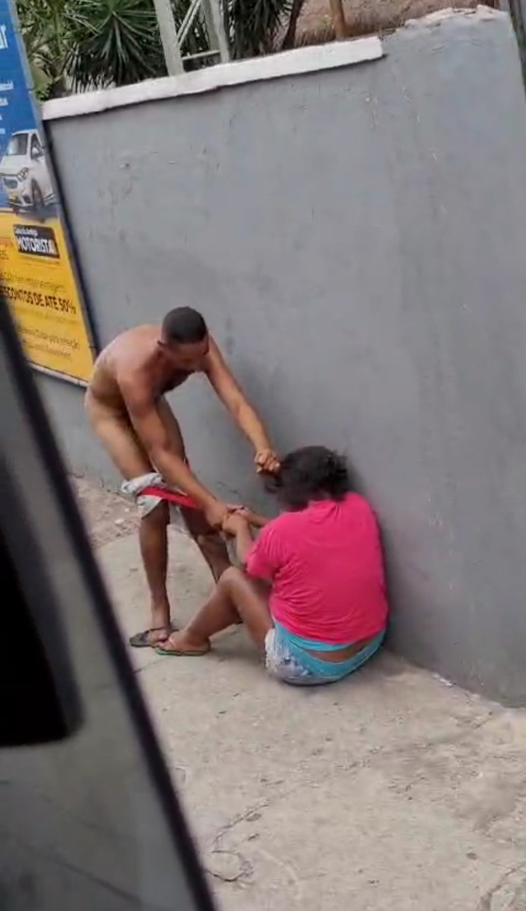 Um homem e uma mulher se atracaram, o indivíduo estava segurando a mulher e arrancado os cabelos dela na unha, por outro lado a mulher estava puxando e rasgando a bermuda do homem o deixando pelado