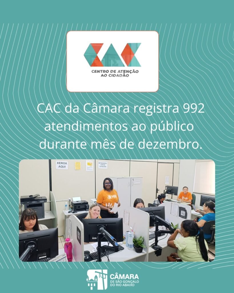 O CAC da Câmara de São Gonçalo do Rio Abaixo divulgou o seu último relatório mensal referente a 2025. Em dezembro, foram realizados 992 atendimentos à população, com 4.415 cópias sendo registradas no período.