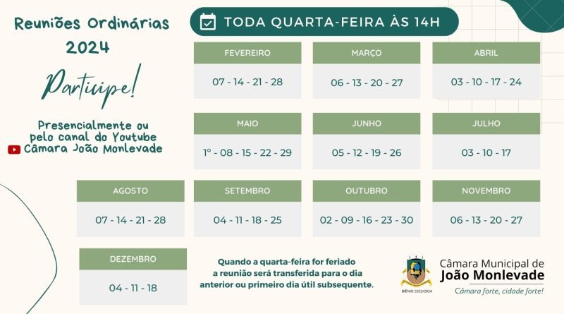 As datas das reuniões ordinárias da Câmara Municipal de João Monlevade para o ano de 2024 já estão definidas. A primeira reunião será realizada no próximo dia 7 de fevereiro. Conforme prevê o Regimento Interno da Casa, as sessões são realizadas todas às quartas-feiras às 14h.