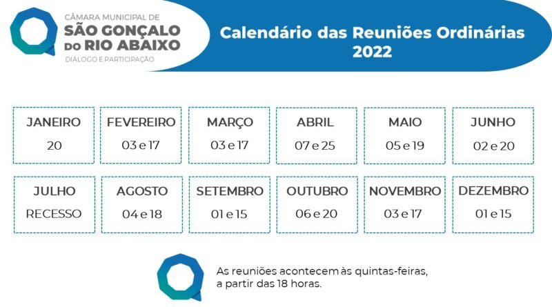 No dia 3 janeiro, o Presidente da Câmara Municipal de São Gonçalo do Rio Abaixo, vereador Diego José Ribeiro (PDT), assinou a Portaria nº 01/2022, que define todas as datas em que serão realizadas as reuniões ordinárias dos vereadores ao longo deste ano.