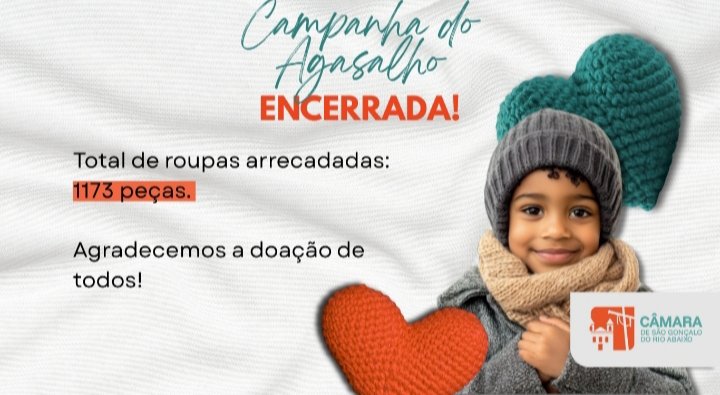 A Campanha do Agasalho é uma ação anual do Legislativo de Municipal, coordenada pela Escola do Legislativo e tem como meta amparar pessoas em vulnerabilidade social da cidade e da região, na estação mais fria do ano. A Câmara de São Gonçalo agradece a todos que se mobilizaram e contribuíram com as doações para aquecer o inverno de quem mais precisa.