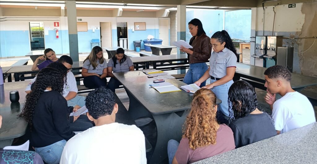 Durante a dinâmica, os alunos Fábio e Pedro simularam formas de comunicação utilizadas por pessoas com deficiência total ou parcial na fala, enquanto os demais colegas tentavam compreender a mensagem e oferecer apoio.