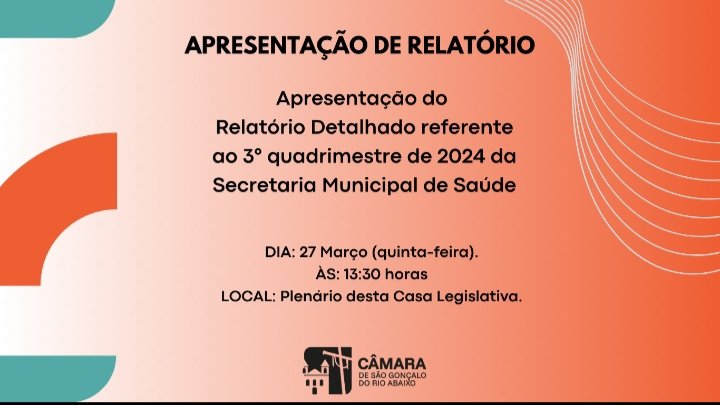No próximo dia 27 de março, quinta-feira, acontecerá no plenário da Câmara de São Gonçalo, a apresentação do Relatório Detalhado do Quadrimestre Anterior (RDQA), com apresentação das metas fiscais por parte da Secretaria de Saúde do município. Os dados fazem alusão aos últimos 4 (quatro) meses de 2024: Setembro, Outubro, Novembro e Dezembro.