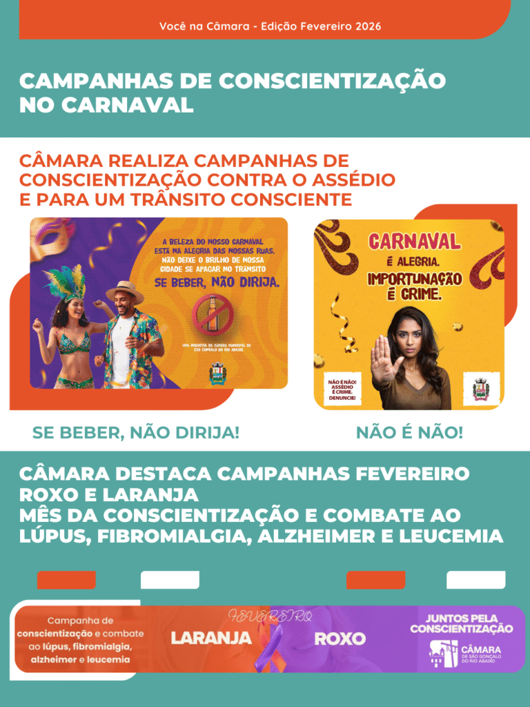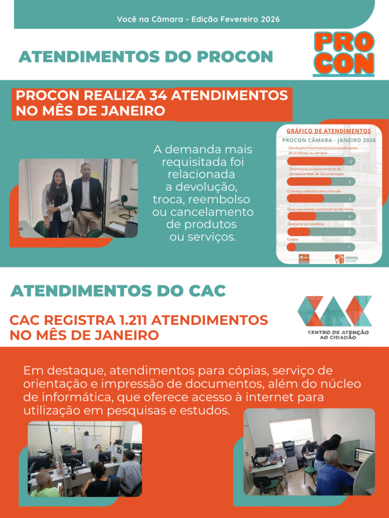 A Casa Legislativa divulga o informativo “Você na Câmara”, que reúne os principais destaques: projetos, indicações e moções aprovadas, campanhas apoiadas pela Casa, os atendimentos realizados pelo CAC e pelo Procon, além das ações desenvolvidas pelo Parlamento Jovem Minas.