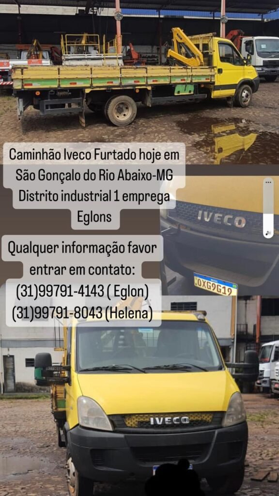 Esse veículo é um veículo de cor amarela e pode estar próximo de São Gonçalo do Rio Abaixo, pois a Eglons Reformas foi inaugurada na última sexta-feira, tem vigia noturno mas o roubo aconteceu justamente no dia da folga do vigia.