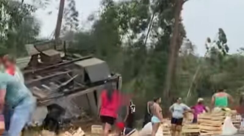 Caminhão tomba no Corte de Pedras e a carga “evapora”