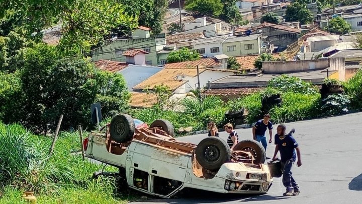 Caminhonete carregada com botijões de gás capotou hoje em Pedro Leopoldo