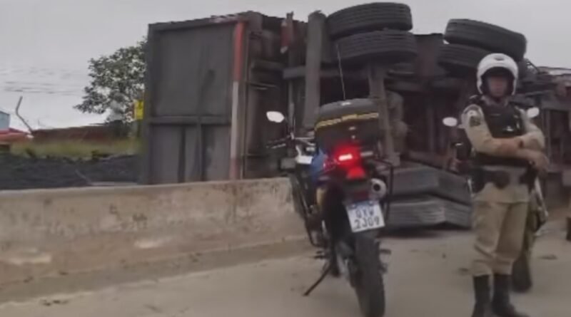 Carreta carregada com carvão tomba no Anel Rodoviário