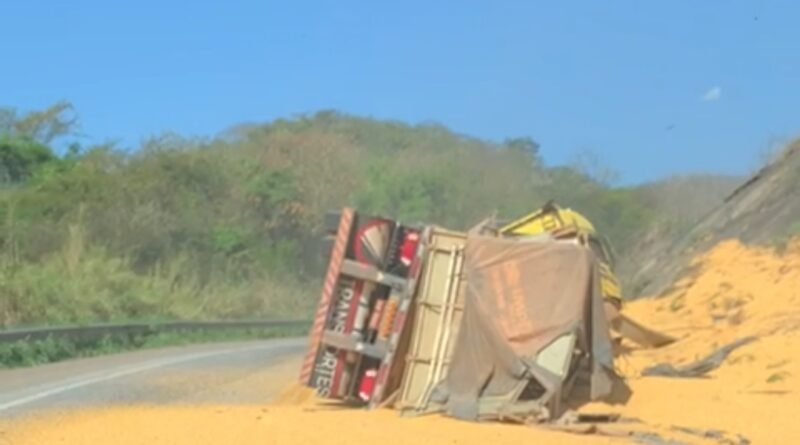 Se for utilizar a trecho tenha bastante atenção, pois pode haver pessoas recolhendo a carga que se espalhou pelo local. O trânsito flui em meia pista e o condutor da carreta não se feriu.