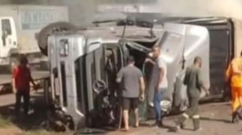 Carreta carregada com palitos de fósforo tomba pega fogo e motorista fica preso às ferragens na BR-381 em Itatiaiuçu