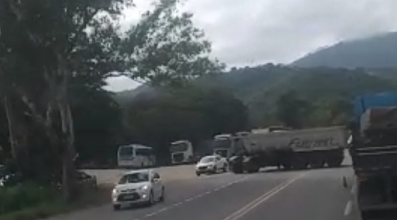 A PRF foi acionada para registrar a ocorrência com a carreta caçamba e fez o controle do trânsito.
