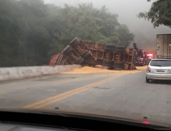 Uma carreta carregada com milho tombou entre João Monlevade e São Gonçalo na ponte coronel.