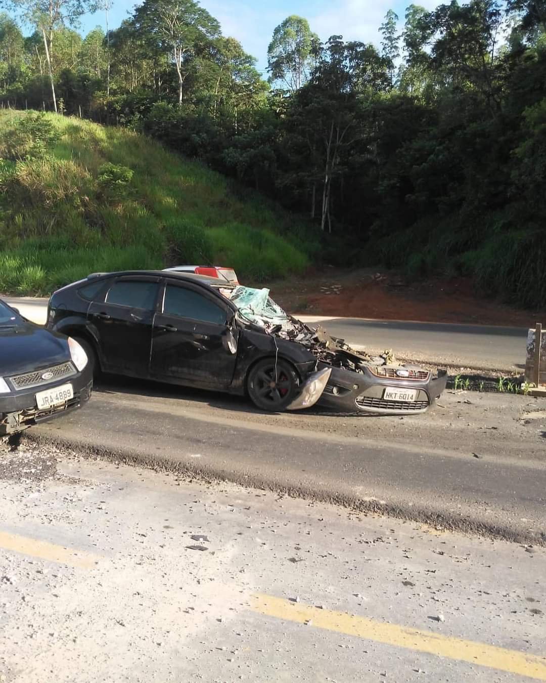Um Ford Focus placa HKT 6014 ficou destruído após bater na traseira de um ônibus hoje (9), por volta das 7h10 na BR-381, em Barão de Cocais. O acidente ocorreu na comunidade do Boa Vista, no final da duplicação da rodovia. Apesar do impacto, não foi registrado vítimas fatais. O trânsito ficou lento na região