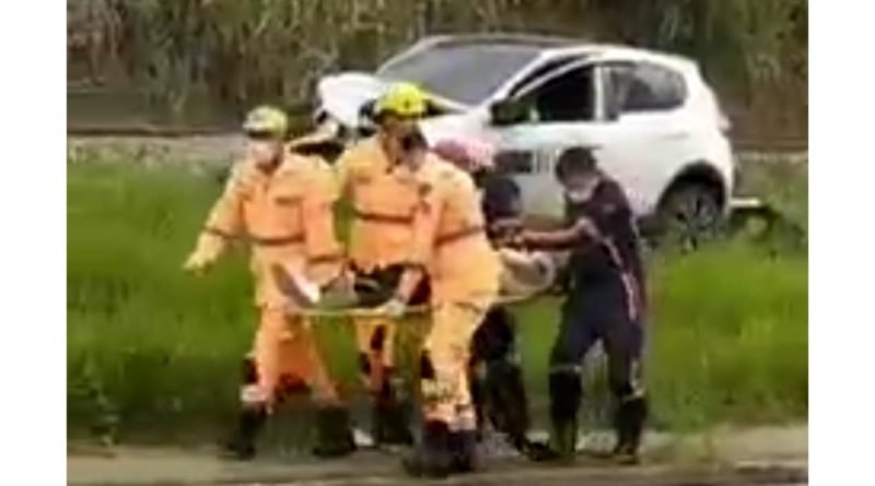 Informações dão conta que o carro foi parar sobre a linha férrea e o motociclista ficou ferido após ser atingido pelo poste de energia da Concessionária CEMIG. Não se sabe o estado de saúde do condutor do automóvel.
