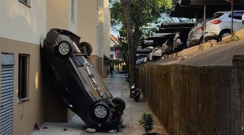 Segundo o Corpo de Bombeiros, o carro voltou de ré e caiu de aproximadamente três metros de altura parando na área comum de um dos blocos do residencial.
