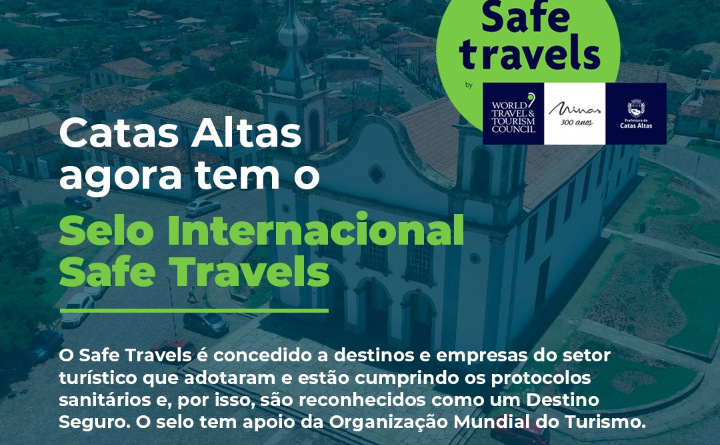O município de Catas Altas conquistou o Selo Internacional de Turismo Seguro “Safe Travels”, criado pelo Conselho Mundial de Viagens e Turismo (WTTC – World Travel & Tourism Council).