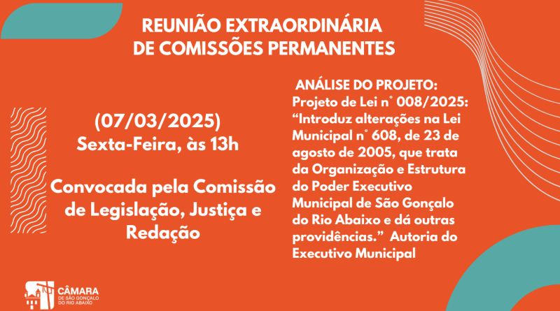 Read MoreComissão De Legislação, Justiça e Redação da Câmara de São Gonçalo convoca Reunião Extraordinária Nesta sexta, às 13h, a Câmara