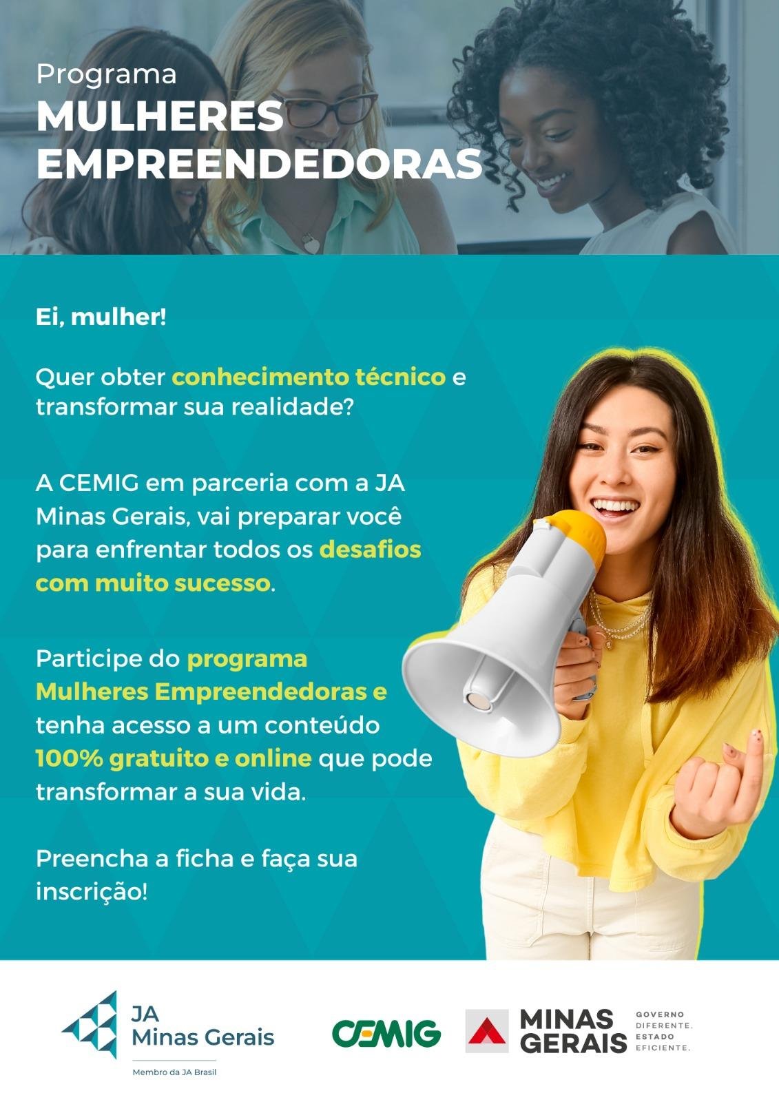 O Programa Você – Voluntariado Cemig vai promover a 2ª edição 2023 do projeto “Mulheres Empreendedoras online”, com a metodologia da Junior Achievement – JA Minas Gerais. A formação, que é gratuita, é uma ótima chance para o público feminino participar, de forma online e segura, de um processo empoderador e que pode criar diversas oportunidades futuras no mundo dos negócios.