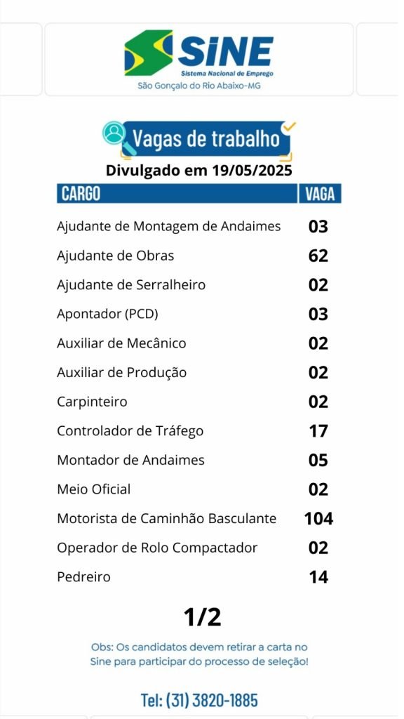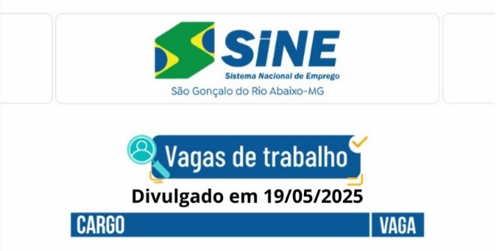 Médio Piracicaba Centenas de vagas de emprego à sua espera no SINE São Gonçalo do Rio Abaixo (Boa sorte aos candidatos) 19 de maio de 2025 portaldomediopiracicaba@gmail.com Redação