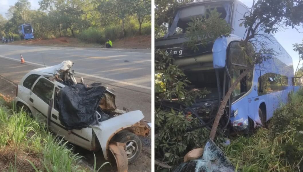 A Polícia Civil informou que o carro de passeio tentou fazer uma ultrapassagem no km 373 da rodovia e bateu de frente com o ônibus. A colisão aconteceu por volta das 5h. Com o impacto, o carro ficou destruído e o ônibus foi parar em uma área de mata às margens da rodovia