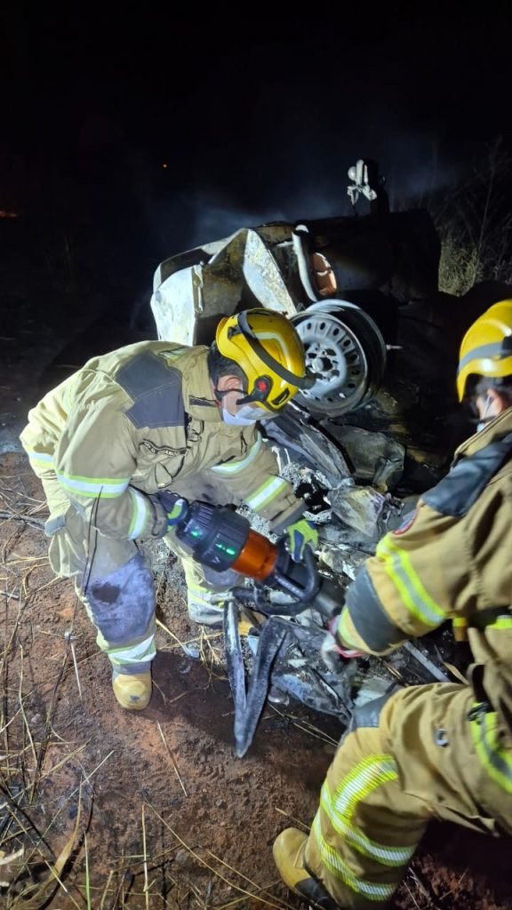 Enquanto aguardavam a chegada da funerária, os militares do Corpo de Bombeiros estudaram cuidadosamente a melhor forma de acessar o interior do automóvel, já que as vítimas carbonizadas estavam presas na parte dianteira do veículo. O trabalho exigiu paciência e precisão devido ao estado em que o carro se encontrava.