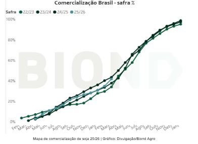 “Embora a safra brasileira de soja de 2026 seja estimada em expressivas 177 milhões de toneladas, reforçando a percepção de oferta abundante, o foco do mercado está na disponibilidade real para venda. Produção elevada não significa oferta imediata: entre a colheita e a comercialização, o fator determinante é o comportamento do produtor. Nossos dados demonstram que uma parcela significativa da safra ainda permanece fora do mercado”, explica Felipe Jordy, gerente de inteligência e estratégia da Biond Agro.