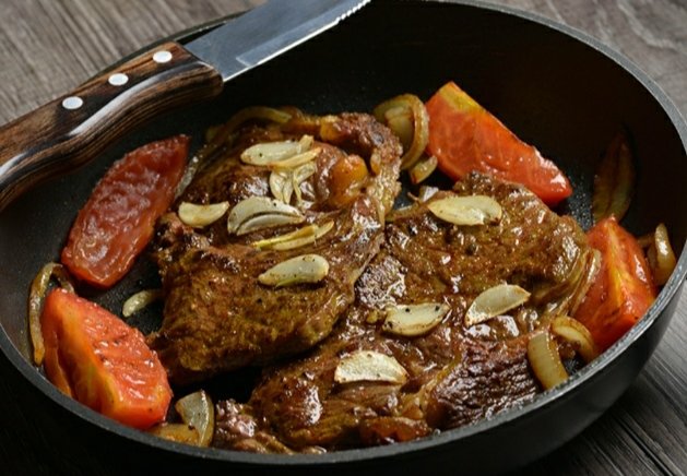 ● 500g de contra filé em bifes ● 1 colher (café) de Sal Rosa do Himalaia Kitano Reserva ● 2 colheres (sopa) de óleo ● 1 colher (café) de Pimenta-do-Reino Preta Moída Kitano ● 2 colheres (chá) de Curry Kitano ● 1 dente de alho grande cortado em fatias ● 1 cebola média cortada em fatias finas ● 2 tomates grandes cortados em pétalas