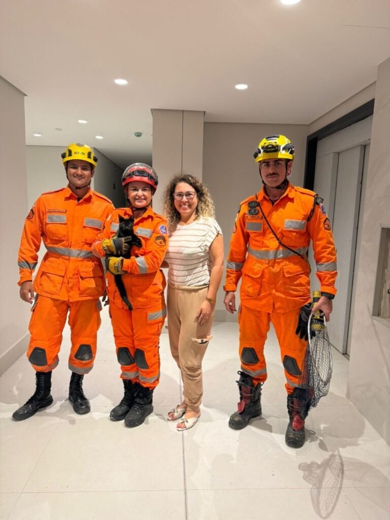 Na noite desta segunda-feira (20), Bombeiros foram acionados para uma ocorrência delicada: um gato havia caído do décimo andar de um prédio e ficou preso no sétimo andar, em um vão da estrutura (anteparo do ar condicionado).
