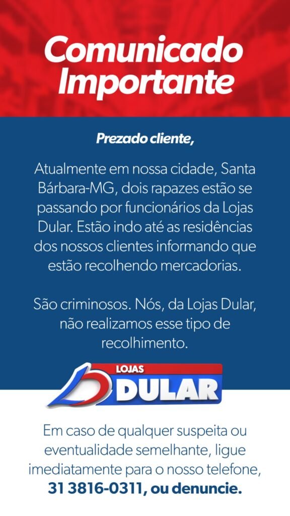 Se alguém bater na porta de sua residência e citar estar recolhendo produtos em nome da Lojas Dular ou outra empresa ou outra pessoa, desconfie e ligue para a loja, para a empresa ou a pessoa que está sendo citada.