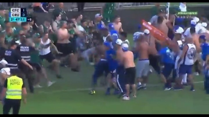 Dali para frente o desespero bateu, e a torcida do Cruzeiro invadiu o gramado, cenas de selvageria, a torcida do Curitiba também invadiu o campo, foi briga, chutes e porradas para todo lado.