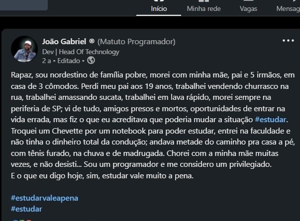Quem hoje vê “O Matuto Programador”, presente no Linkedin com mais de 80 mil seguidores, provavelmente não conhece a trajetória de vida do baiano de Uibaí. Ainda na adolescência, João Gabriel e sua família se mudaram para São Paulo em busca de uma vida melhor. Para ajudar seus familiares, trabalhou como lavador de carros, prensador de sucata e vendedor de espetinho de churrasco.