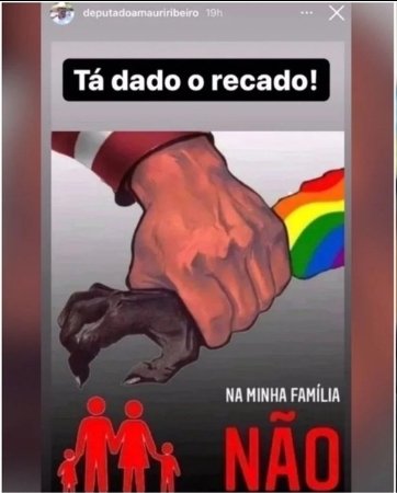 O deputado goiano Amauri Ribeiro (UB) foi indiciado pelo crime de racismo homofóbico após postar a foto de uma mão branca apertando o punho de um braço negro, que “veste” uma roupa de arco-íris (símbolo do movimento LGBTQIA+), com a frase “na minha família não!”. A imagem foi publicada em abril deste ano.