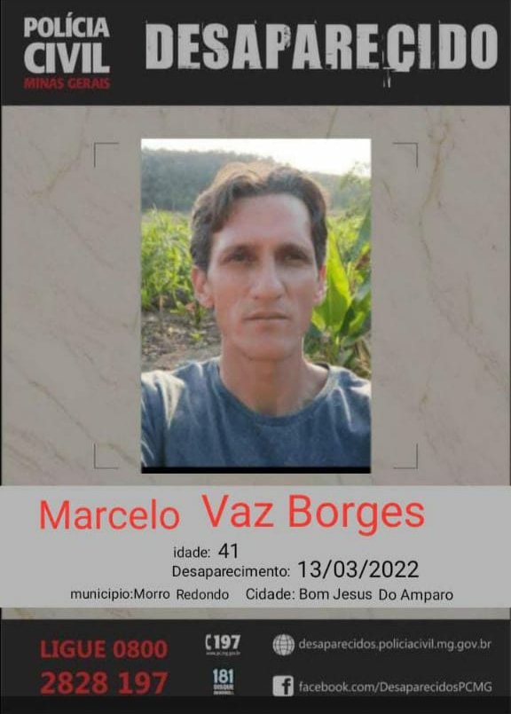 Polícia Desaparecido Marcelo Vaz Borges Bom Jesus do Amparo MG 8 de maio de 2022 portaldomediopiracicaba@gmail.com Redação Fonte : BHnoQap