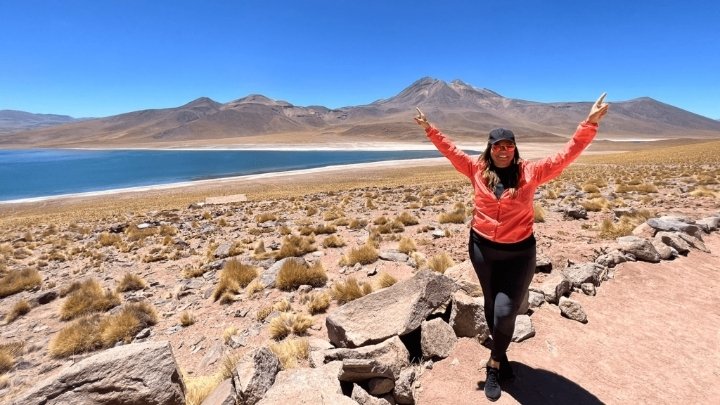 Um dos cartões postais do Deserto do Atacama é uma lagoa que fica repleta de flamingos, cujas águas têm de 3 a 4 vezes mais sal do que o mar, algo que não impede a habitação desses animais. É um ecossistema que merece ser visitado, de acordo com Renata.
