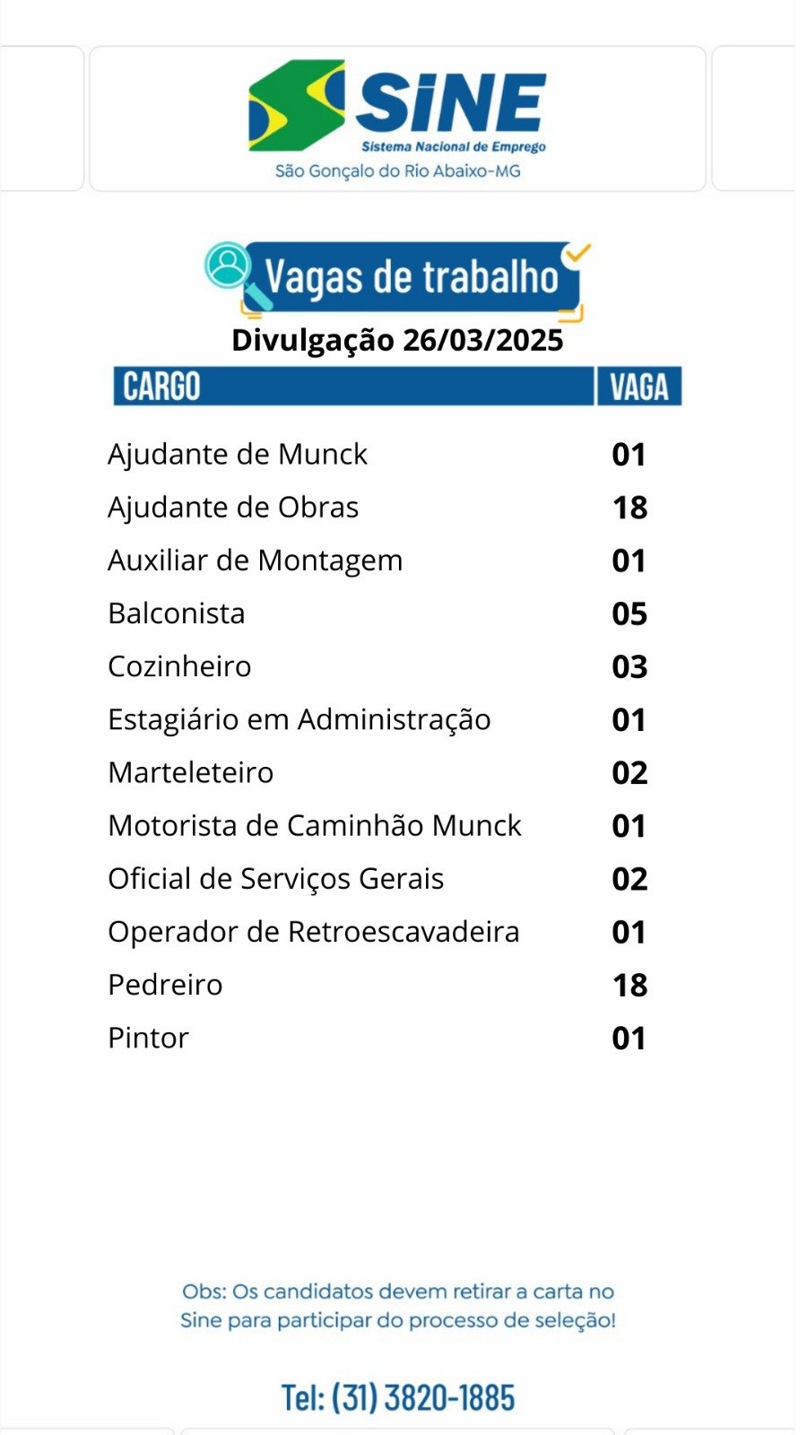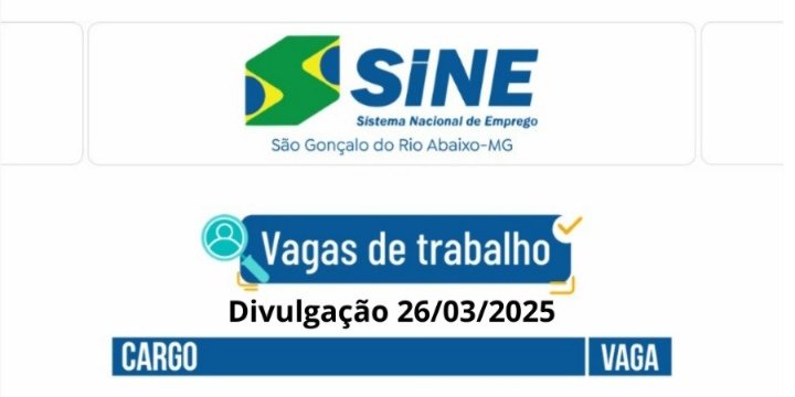 Dezenas de vagas de emprego para está quarta-feira (26/03) no SINE São Gonçalo do Rio Abaixo (Boa sorte aos candidatos)