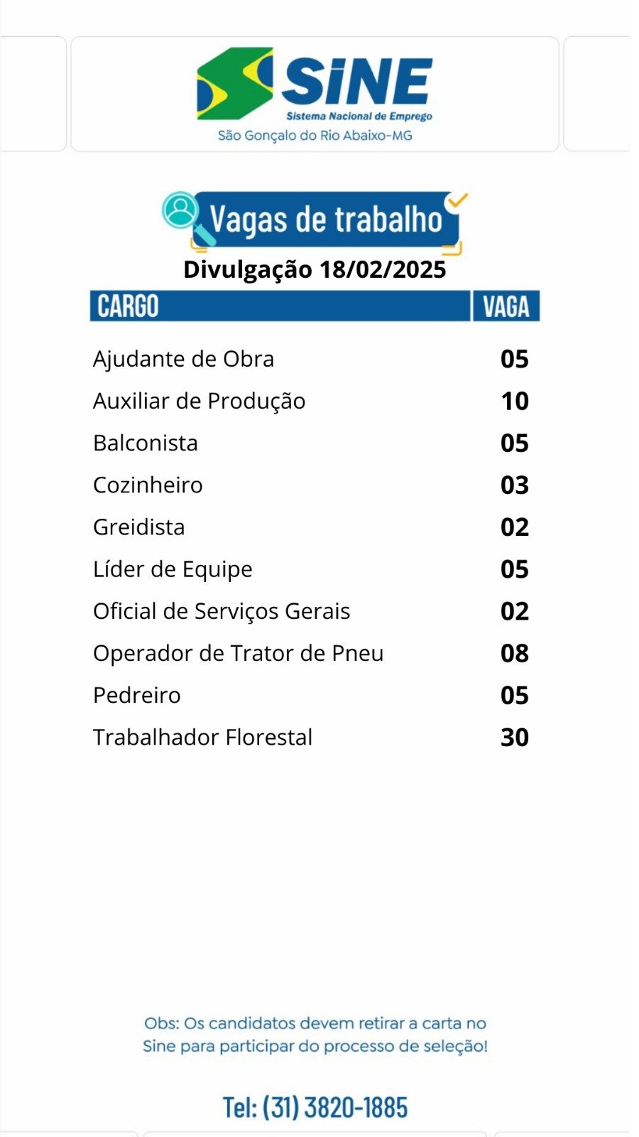 Médio Piracicaba Dezenas de VAGAS DE EMPREGO para hoje (18/02) no SINE São Gonçalo do Rio Abaixo (Boa sorte aos candidatos) 18 de fevereiro de 2025 portaldomediopiracicaba@gmail.com Redação