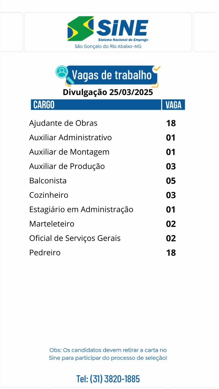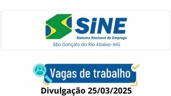 Dezenas de vagas de emprego para hoje (25/03) no SINE São Gonçalo do Rio Abaixo (Boa sorte aos candidatos)