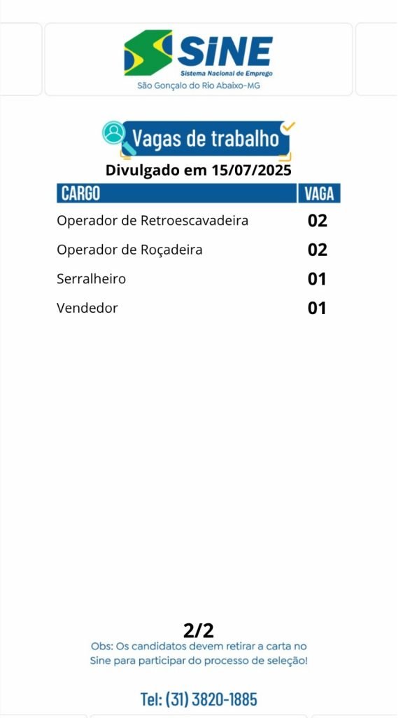 Médio Piracicaba Dezenas de vagas de emprego para hoje terça-feira (15/07) no SINE São Gonçalo do Rio Abaixo (Boa sorte aos candidatos) 15 de julho de 2025 portaldomediopiracicaba@gmail.com Redação