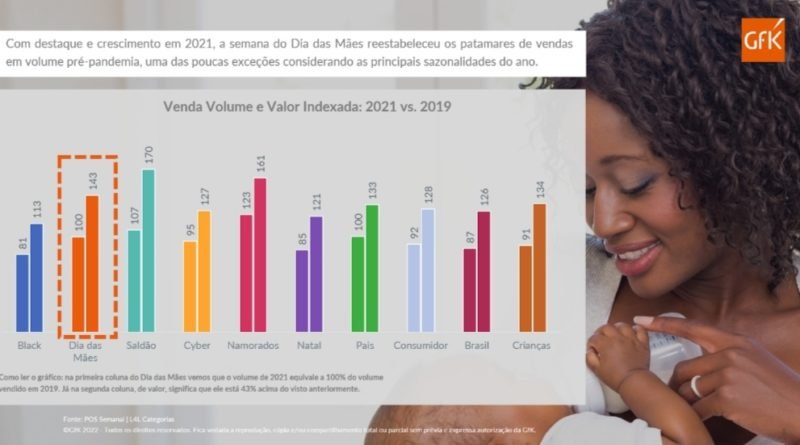 Estudo feito pela GfK, empresa líder em inteligência de consumo e mercado, aponta que o Dia das Mães deve manter o mesmo comportamento de 2021, quando a data comemorativa foi a segunda mais rentável entre os principais períodos de sazonalidade do varejo, recuperando o volume de vendas pré-pandemia. A única data a ter crescimento no ano, mesmo tendo os smartphones no topo dos itens mais buscados, tem foco no sortimento de eletroeletrônicos portáteis, com disponibilidade em lojas físicas, como pranchas e modeladores de cabelo.