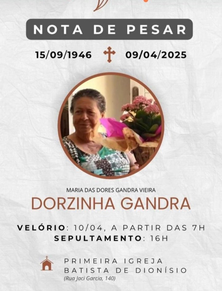 Faleceu na data de hoje (09) de abril de 2025, Maria dos Santos Gandra Vieira, conhecida carinhosamente como Dorzinha Gandra, mulher trabalhadora, mãe de família, nascida no ano de 1946 e faleceu na data de hoje aos 78 anos de idade.