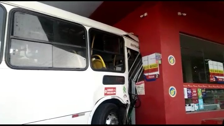 Dois ônibus se chocam hoje, inclusive um deles entra dentro de uma drogaria