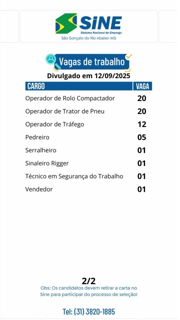 Médio Piracicaba Duzentas e sessenta e nove vagas de emprego para hoje, sexta-feira (12/09) no SINE São Gonçalo do Rio Abaixo (#compartilhe) 12 de setembro de 2025 portaldomediopiracicaba@gmail.com Redação