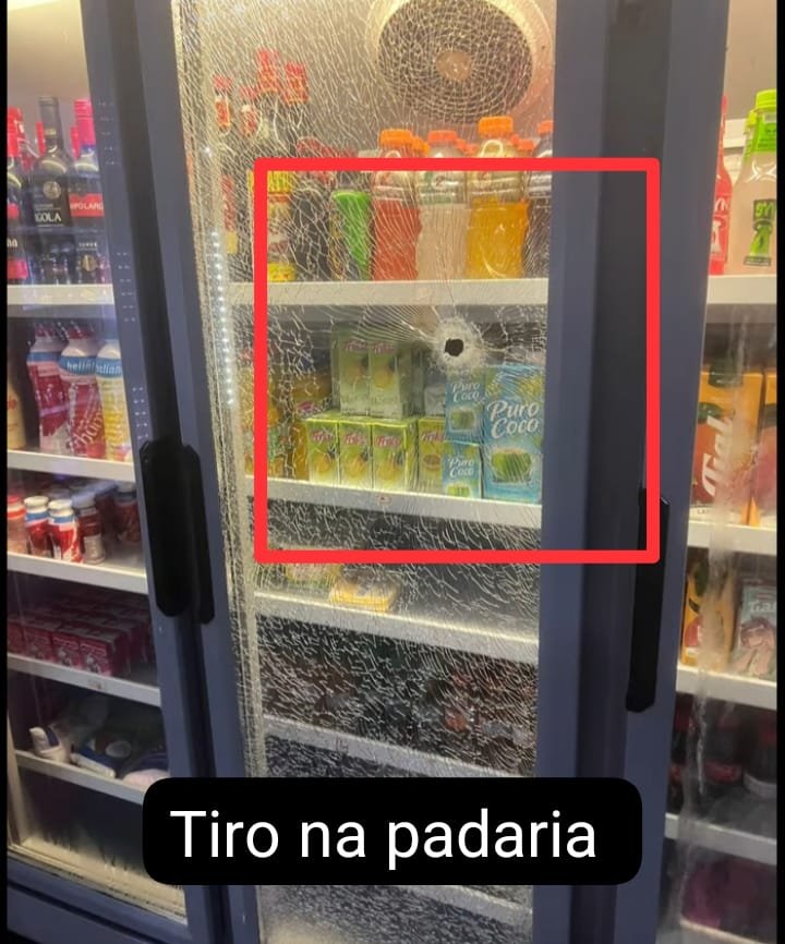 A ocorrência aconteceu em frente de uma padaria, e o freezer foi atingido e outros tiros atingiram o estabelecimento comercial.