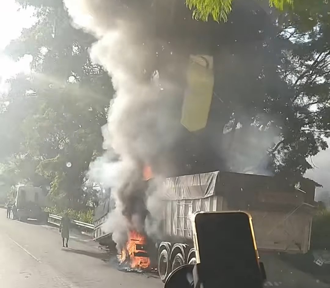 E uma carreta bi-trem pegou fogo hoje na BR-262 entre os trevos de São Domingos do Prata e Vargem Linda.