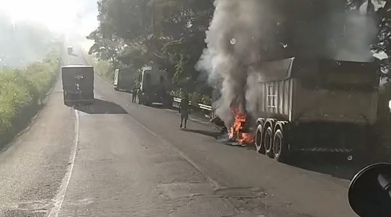 E uma carreta bi-trem pegou fogo hoje na BR-262 entre os trevos de São Domingos do Prata e Vargem Linda.