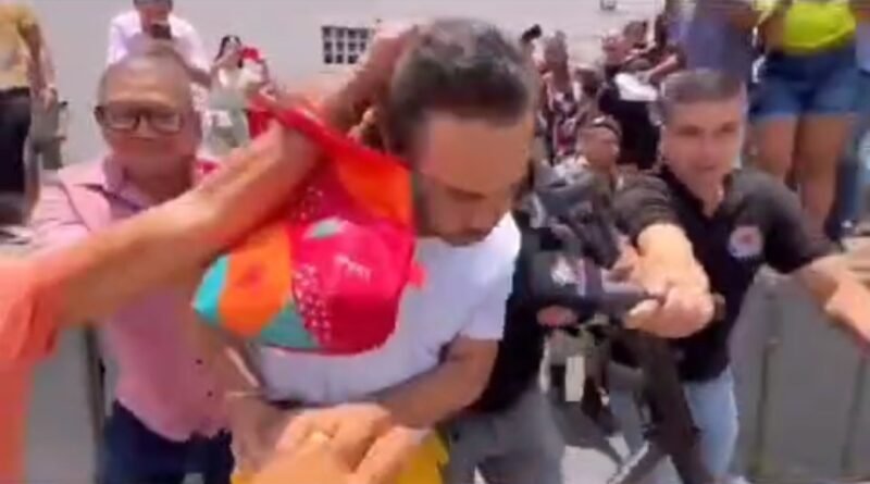 Ao sair várias pessoas partiram para cima do matador de mulheres, pessoas puxavam seu cabelo, tentavam socar, dar murros e se não fosse o efetivo policial certamente haveria o linchamento.