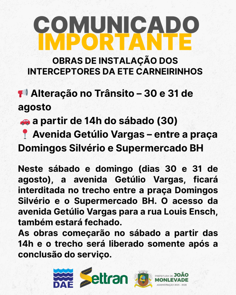 O trânsito na avenida Getúlio Vargas, no trecho compreendido entre a Praça Domingos Silvério e o Supermercado BH, será interditado a partir das 14h deste sábado (30).