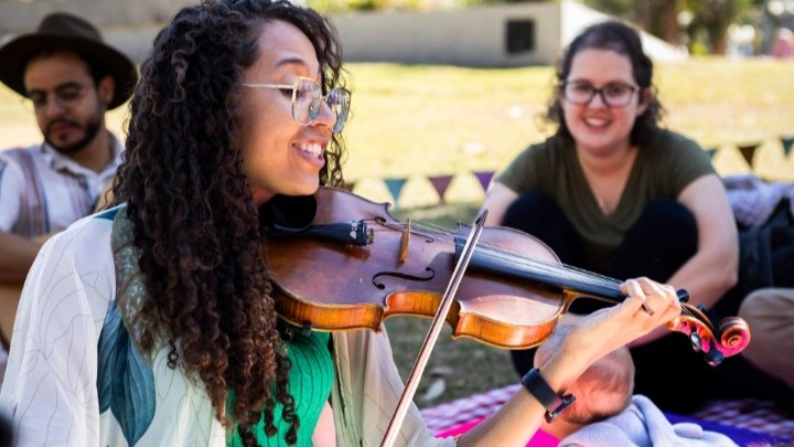 Neste encontro, bebês de 4 meses a 3 anos, acompanhados por seus cuidadores, são convidados a participar de uma roda musical repleta de melodias, canções e brincadeiras cantadas. A atividade, conduzida pela educadora musical Raquel Anastácio, promove uma vivência sensorial que envolve afeto e presença, fortalecendo o vínculo entre os pequenos e seus adultos responsáveis.